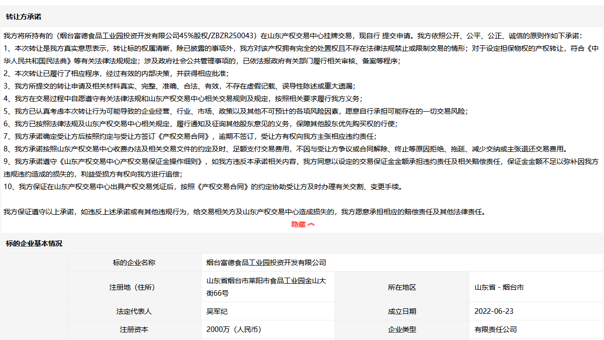 煙臺(tái)富德食品工業(yè)園投資開發(fā)有限公司45%股權(quán)