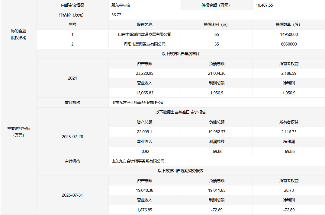 海陽市昊瀚置業(yè)有限公司35%股權及10487.55萬元債權