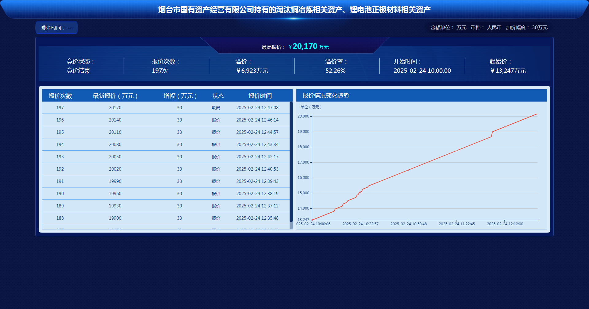 2月24日,“煙臺(tái)市國(guó)有資產(chǎn)經(jīng)營(yíng)有限公司持有的淘汰銅冶煉相關(guān)資產(chǎn)、鋰電池正極材料相關(guān)資產(chǎn)項(xiàng)目”在山東產(chǎn)權(quán)交易中心以網(wǎng)絡(luò)競(jìng)價(jià)方式成功出讓。此次交易歷經(jīng)197輪激烈競(jìng)價(jià),持續(xù)近3小時(shí),最終成交金額定格在20170萬(wàn)元,高于評(píng)估價(jià)8980萬(wàn)元,較掛牌價(jià)溢價(jià)6923萬(wàn)元,溢價(jià)率高達(dá)52.26%,成功創(chuàng)下煙臺(tái)聯(lián)合產(chǎn)權(quán)2025年首季資產(chǎn)盤(pán)活的“開(kāi)門(mén)紅”。